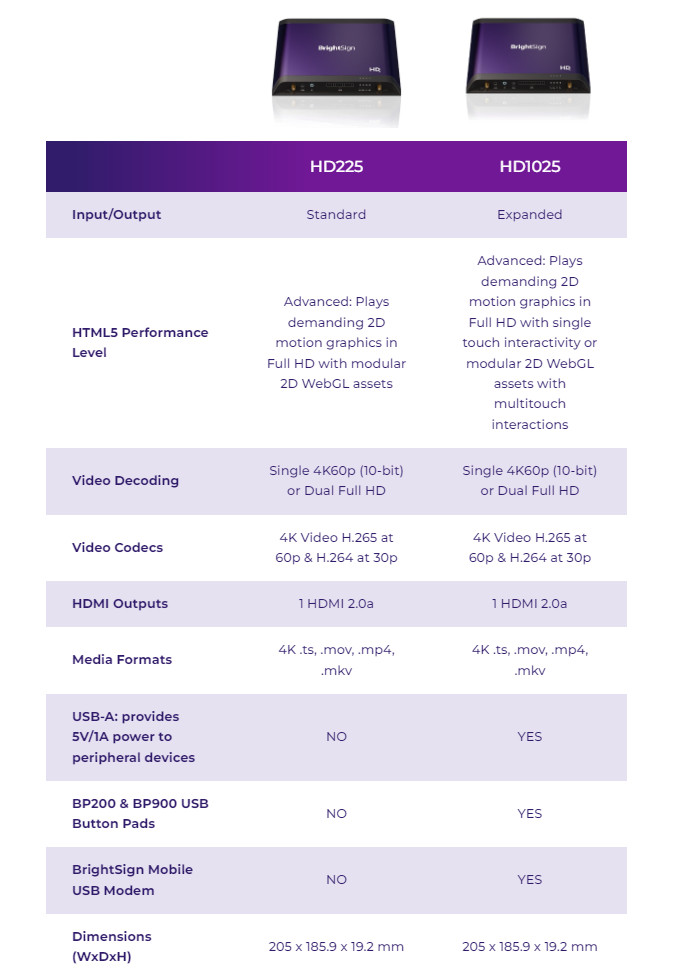 Der BrightSign HD225 ist ein leistungsstarker und vielseitiger Digital Signage-Player, der 4K60p-Video mit HDR10, interaktive HTML5-Animationen und eine Vielzahl von I/O-Anschlüssen unterstützt. Der HD225 ist ideal für die Schaffung immersiver und reaktionsfähiger Erlebnisse, die über den Bildschirm hinausgehen. Mit dem HD225 können Sie ganz einfach Touchscreens, Näherungssensoren, Tasten und andere Peripheriegeräte anschließen und bedienen. Darüber hinaus können Sie Partnerlösungen zur Zielgruppenmessung, Analyse und Monetarisierung nutzen. Der HD225 läuft auf unserem speziell entwickelten BrightSign-Betriebssystem, das legendäre Zuverlässigkeit, Sicherheit und Betriebszeiten bietet. Der HD225 zeichnet sich durch ein ultradünnes Design und ein patentiertes